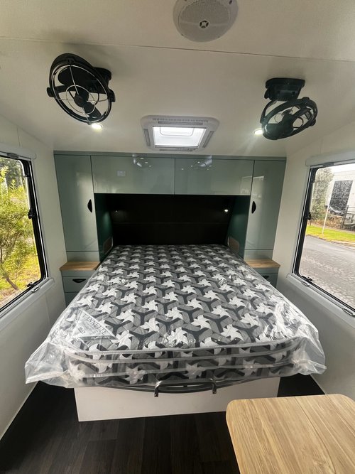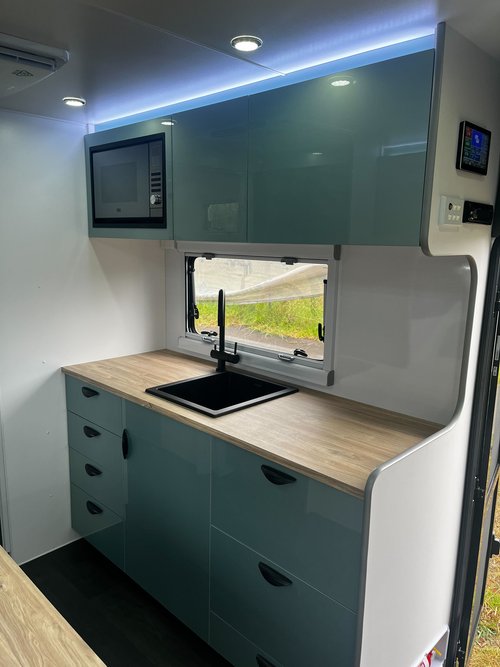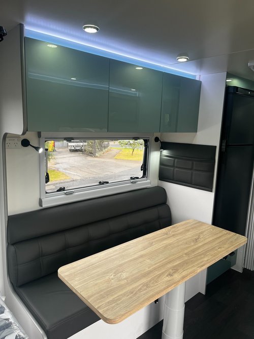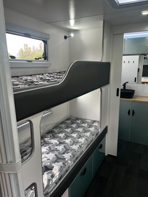 TITUS is packed with extra features. 3700kg Tuffride Independent coil spring suspension, twin shock absorbers, 400w of Solar. A 200amp Aussie made lithium battery and a 99ltr grey water tank allow you to travel further for longer.